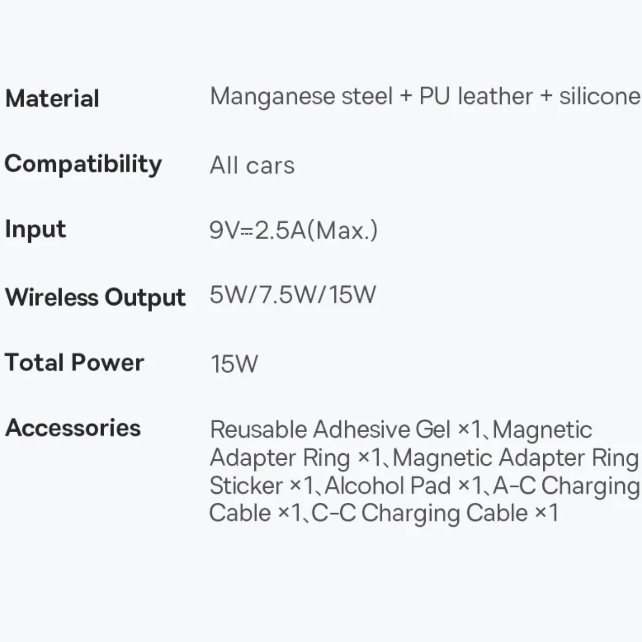 سایر قابلیت ها | - جذب قوی، پایدار و ایمن - مجهز به آهنربای قدرتمند - انعطاف پذیر و قابل خم شدن - شارژ سریع و ایمن - ورودی تایپ سی 9V/2.5A - خروجی وایرلس: 5W/7.5W/15W |