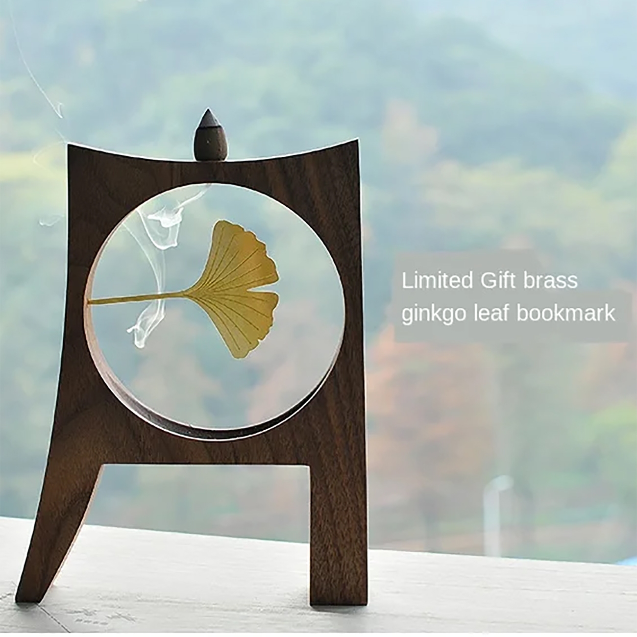 محتویات جعبه | جای بخور چوبی/ 9 عدد چوب صندل بخور / 40 عدد عود چوبی قلمی / یک نشانک برگ جینکو برنجی |