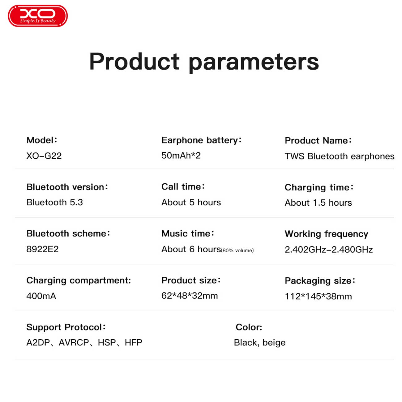 XO Bluetooth earphones G22 TWS ANC + ENC