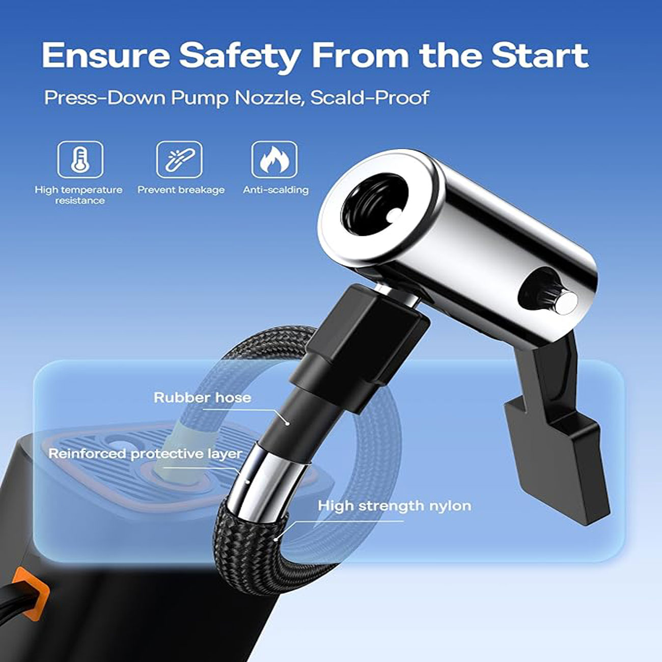محتویات بسته | کابل فندکی خودرو، کابل شارژ Type-C، شلنگ باد، ۳ نازل مختلف، دفترچه راهنما |