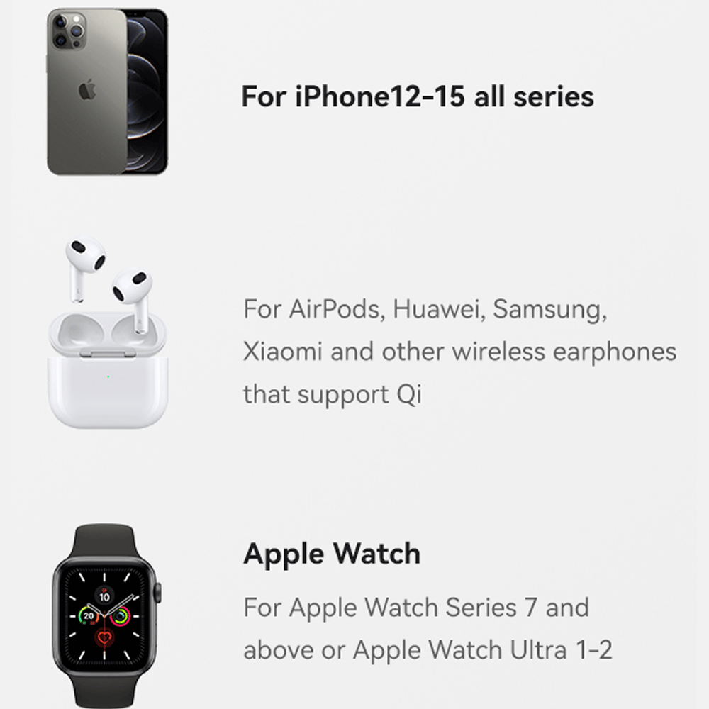 سازگار با | – Apple Watch Series 7 و Ultra 1‑2 – AirPods، سامسونگ، هواوی، شیائومی و سایر هدفونهای Qi‑سازگار – iPhone 12 تا 15 (تمام سریها) |