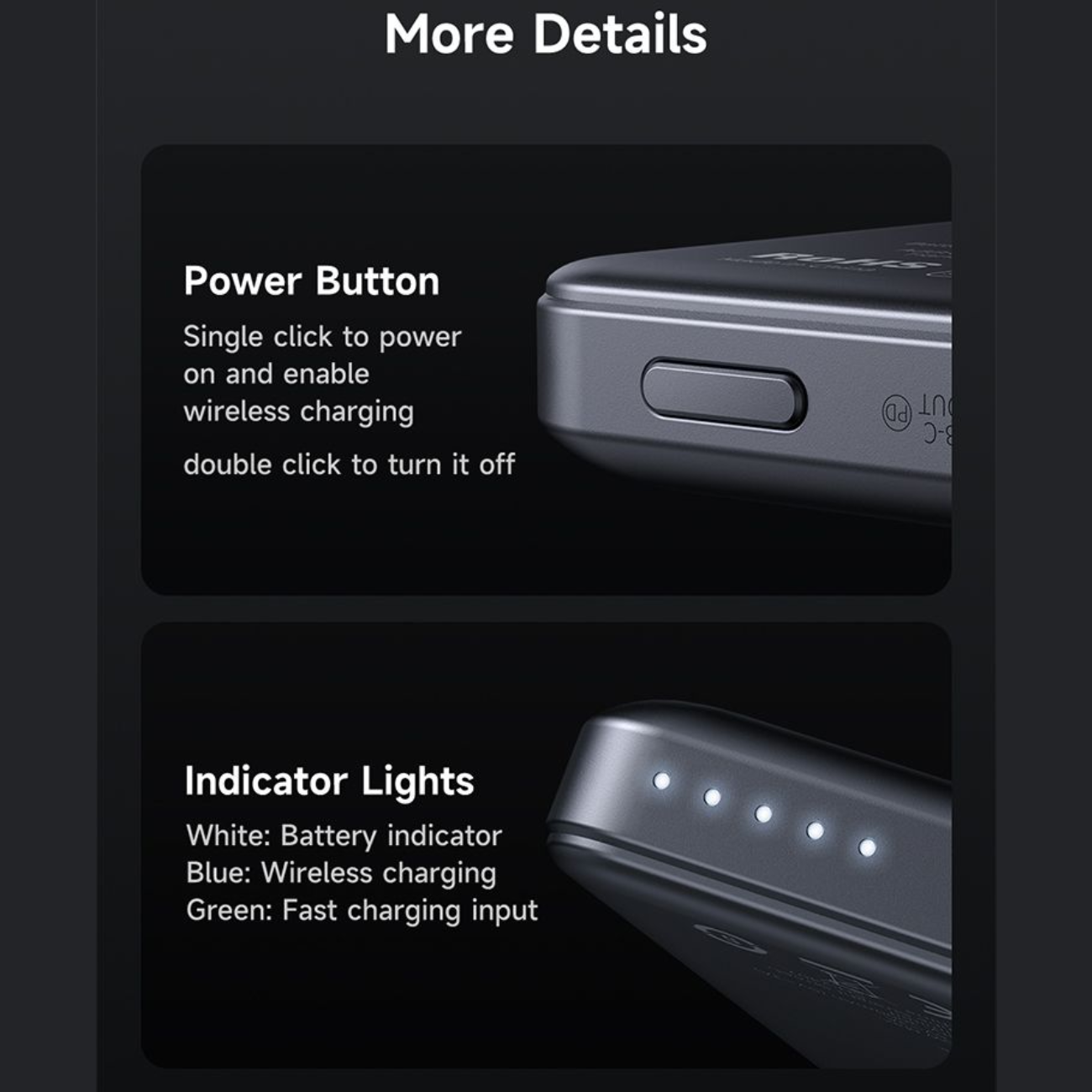 توان خروجی | USB-C: 5V/3A, 9V/2.22A, 12V/1.67A Wireless: 15W/10W/7.5W/5W |