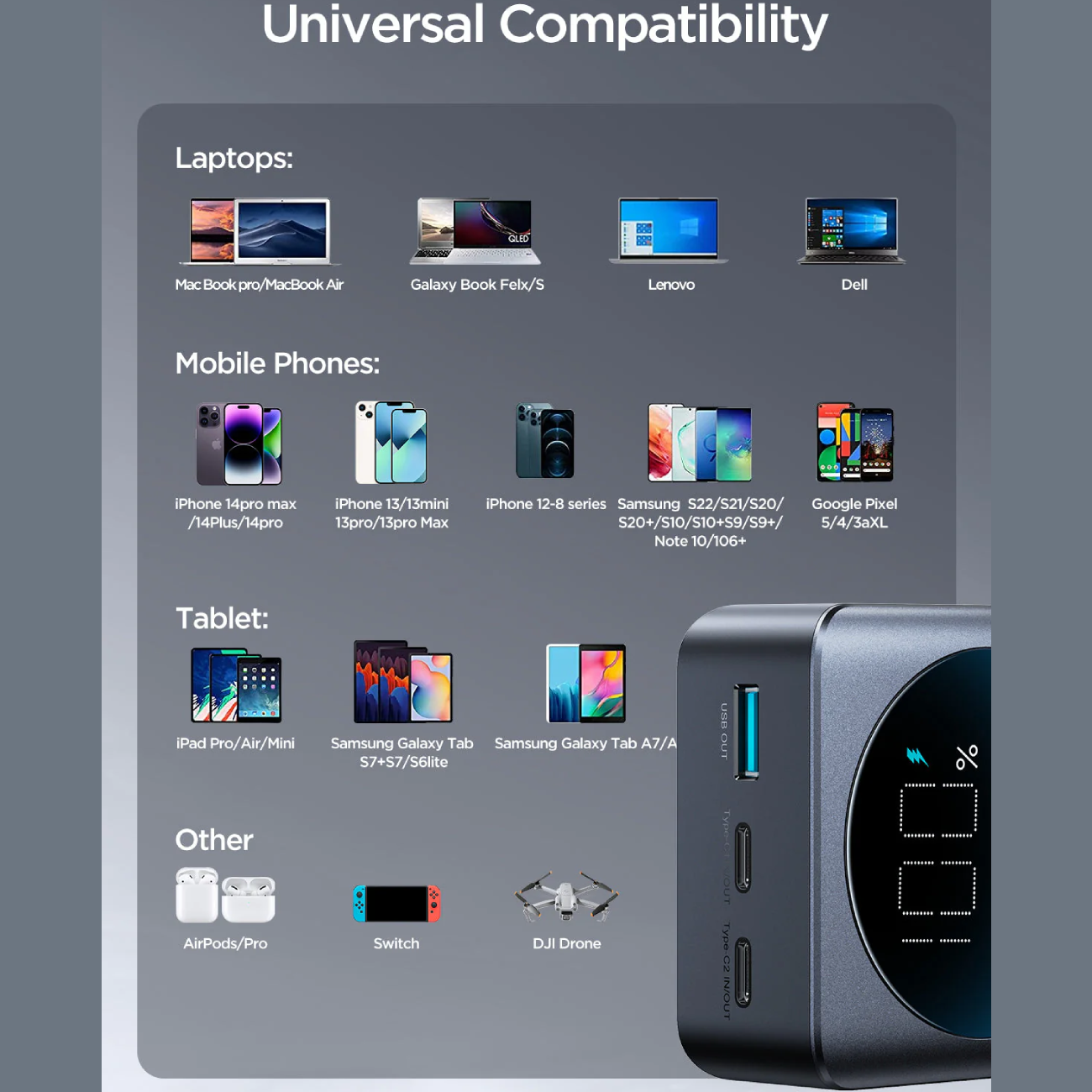 امکانات و قابلیتها | - مجهز به انواع فناوریهای شارژ سریع - شارژ سریع لپ تاپ با توان خروجی 65 وات - دارای 2 پورت ورودی و 3 درگاه خروجی - دارای نشانگر دیجیتالی بزرگ جهت نشان دادن میزان شارژ باقیمانده باتری و نماد فرآیند شارژ سریع - دارای کابل دو سر تایپ سی 5 آمپر و 100 وات |