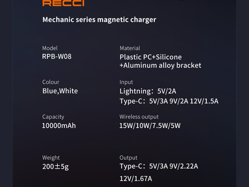 Recci RPB-W08 Machanic Series Magnetic Charger Power Bank 10000mAh