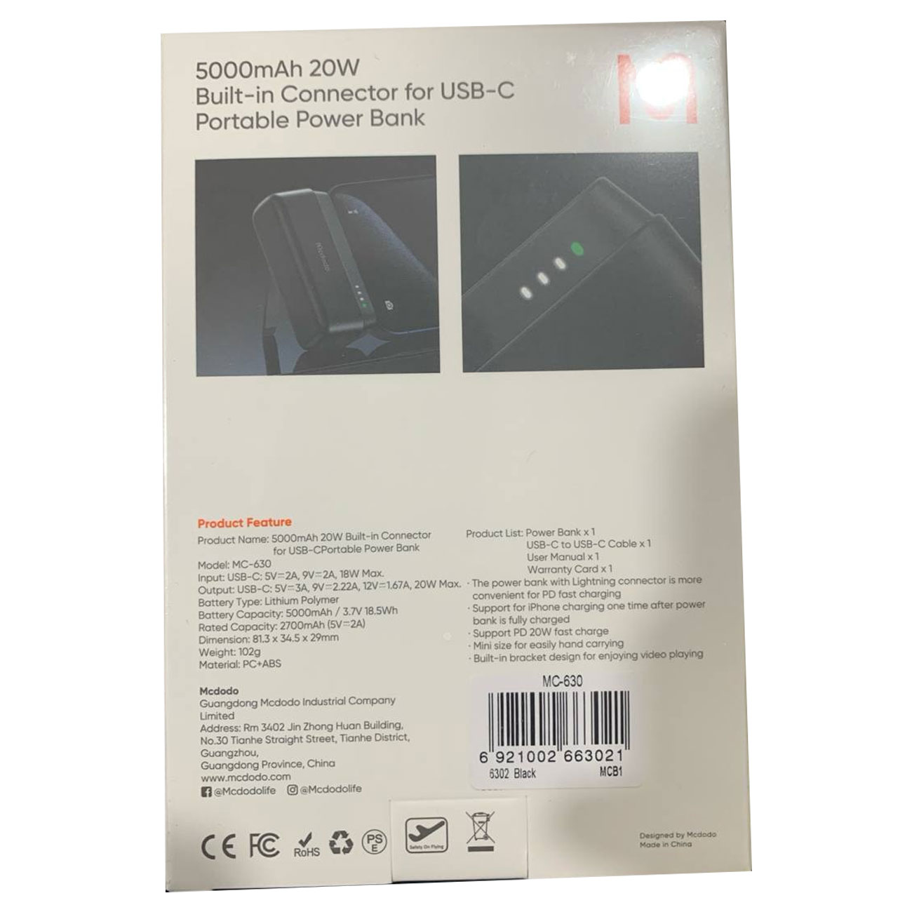 Mcdodo MC-630 5000mAh 20W Built-in USB-C Connector Portable Power Bank