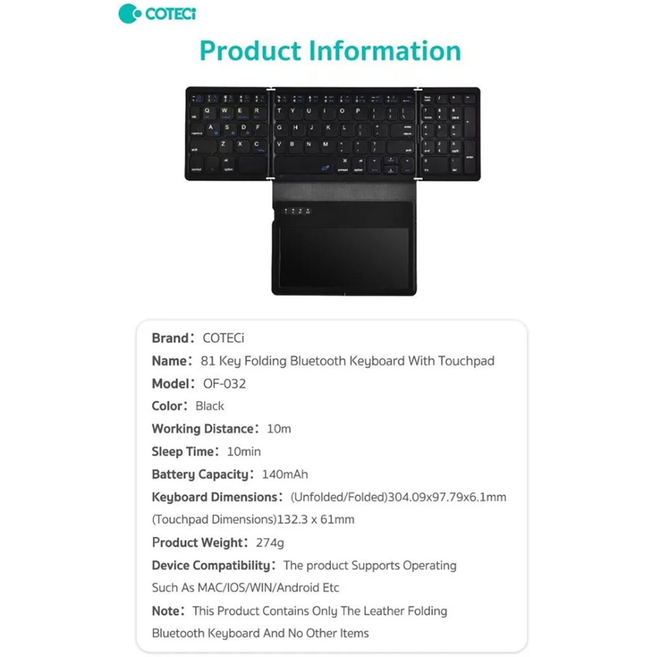COTECi Folding Bluetooth Keyboard with TouchPad OF-032
