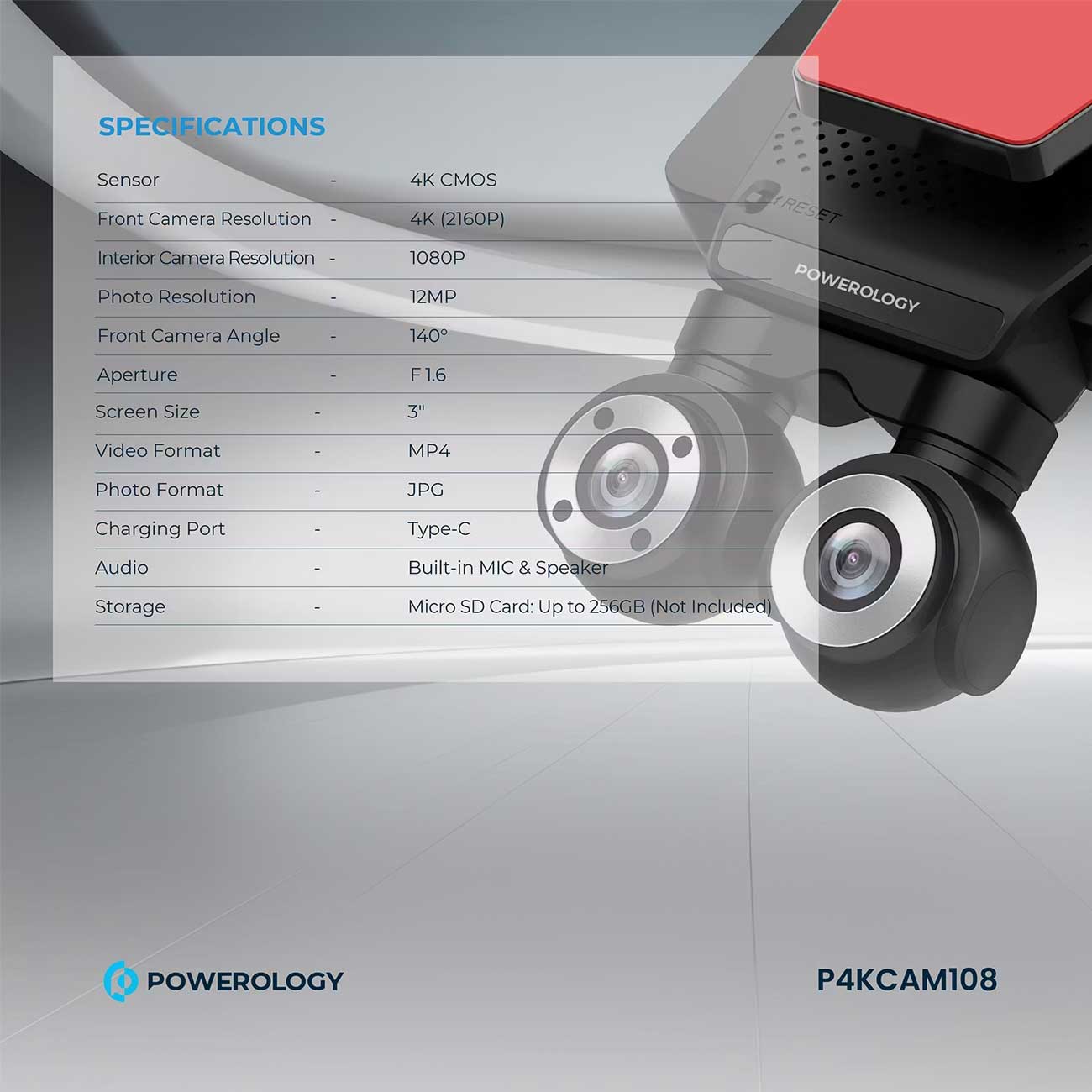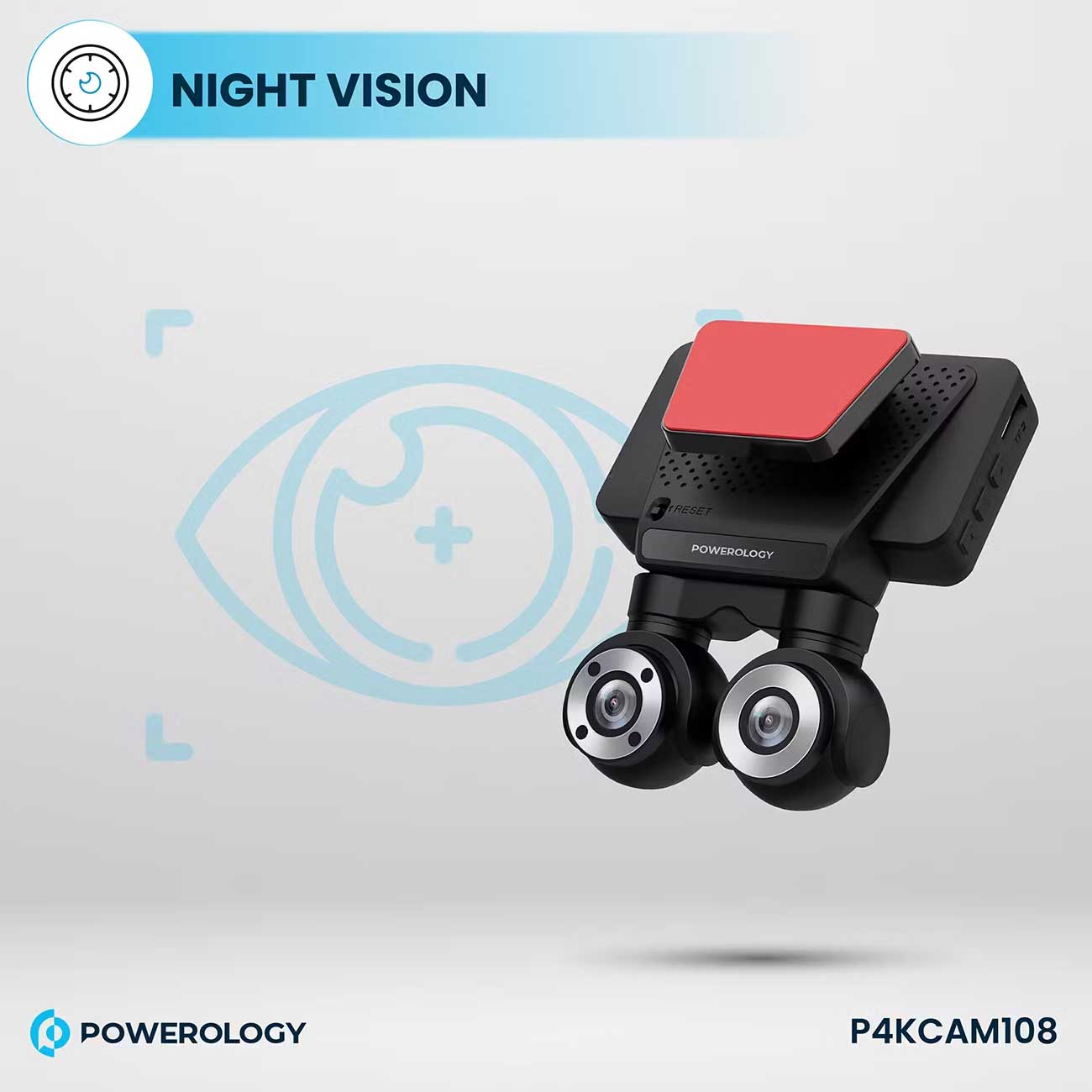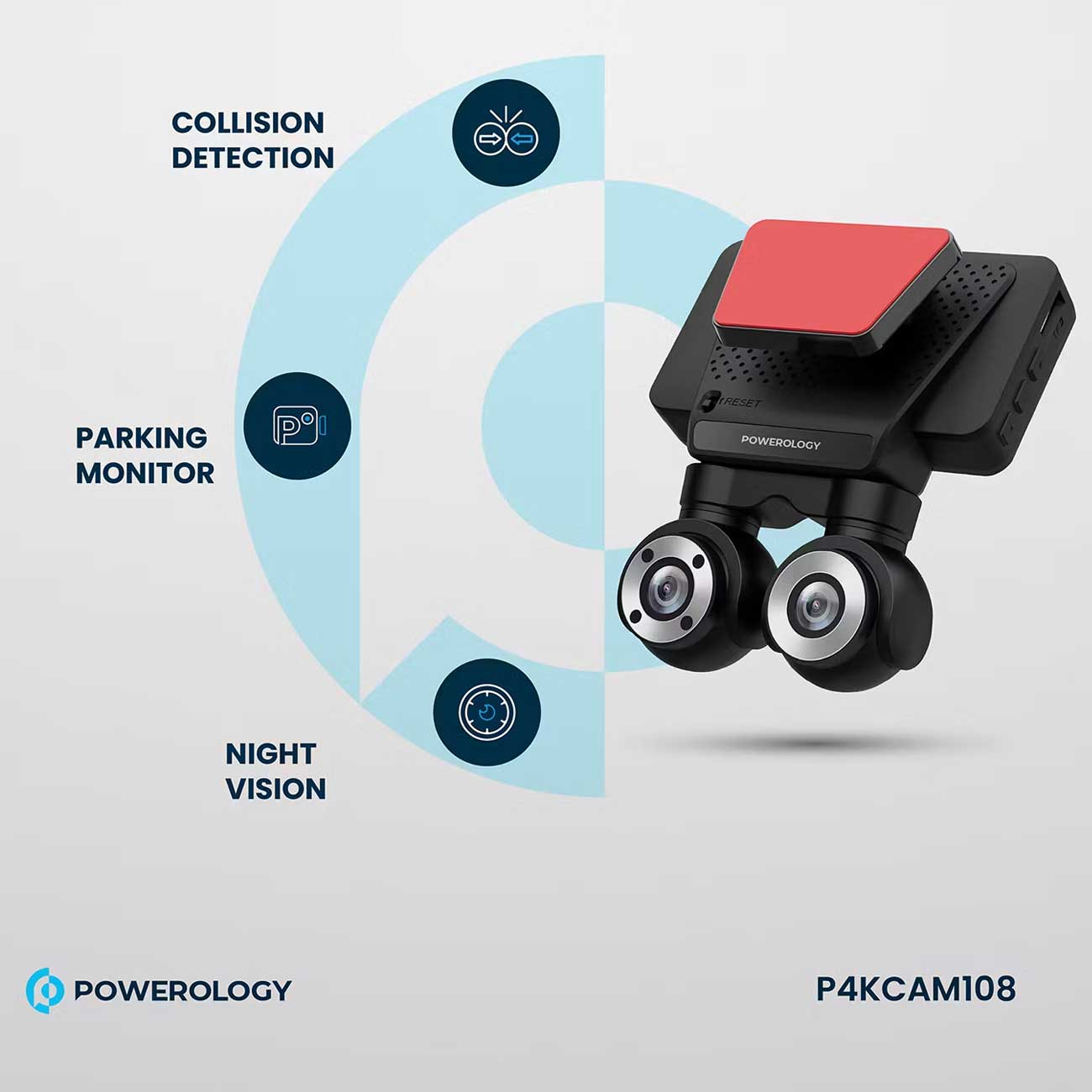 دوربین ثبت وقایع خودرو 4k پاورولوژی P4KCAM108 با دو لنز دوربین