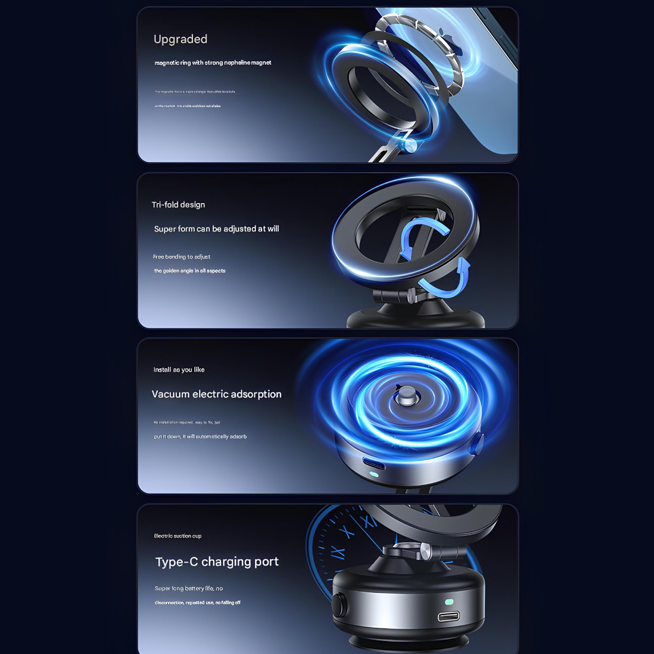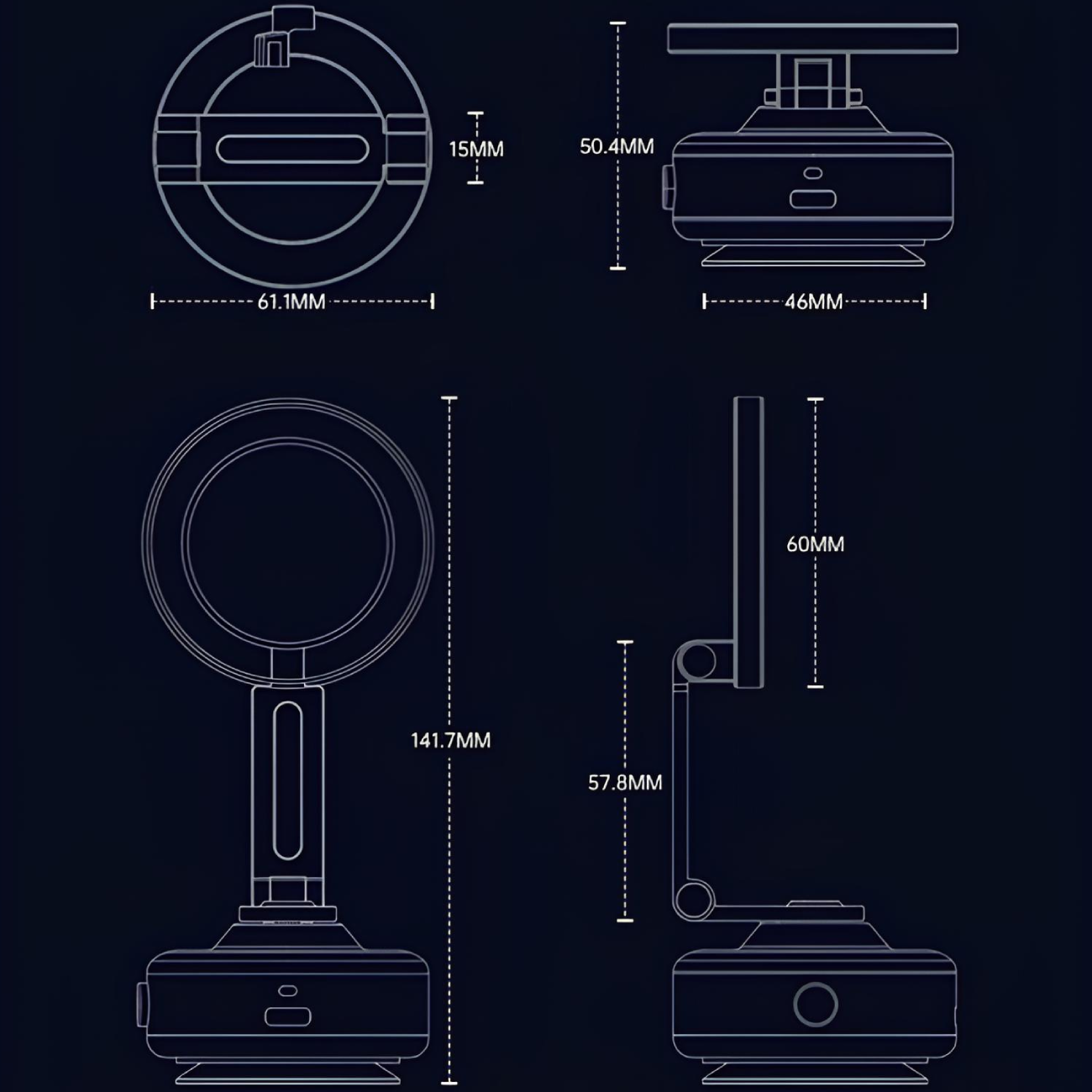 | سایر قابلیت ها | - تکنولوژی مکش: مکش الکتریکی اتوماتیک در عرض 1 ثانیه، بدون آسیب به سطح نصب. - سازگاری با MagSafe: دارای مگنت N52 با ساختار دو حلقهای برای چسبندگی بهتر به گوشی. - مناسب برای استفاده در خودرو، دفتر، و سایر سطوح صاف. |