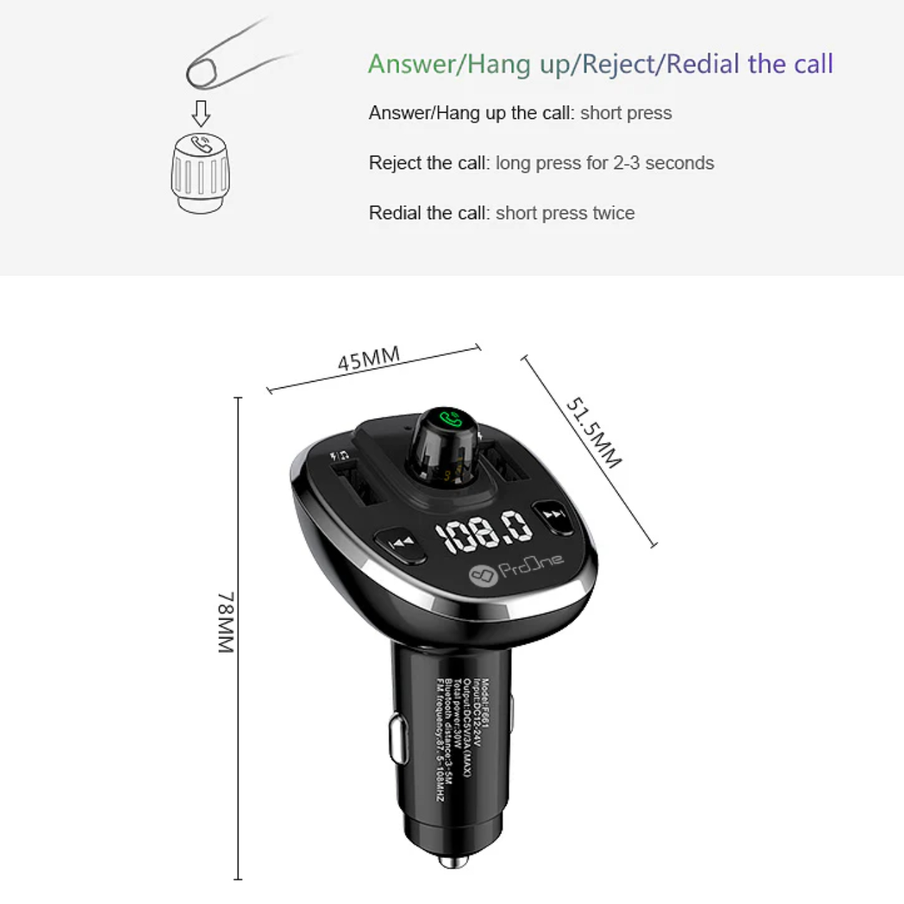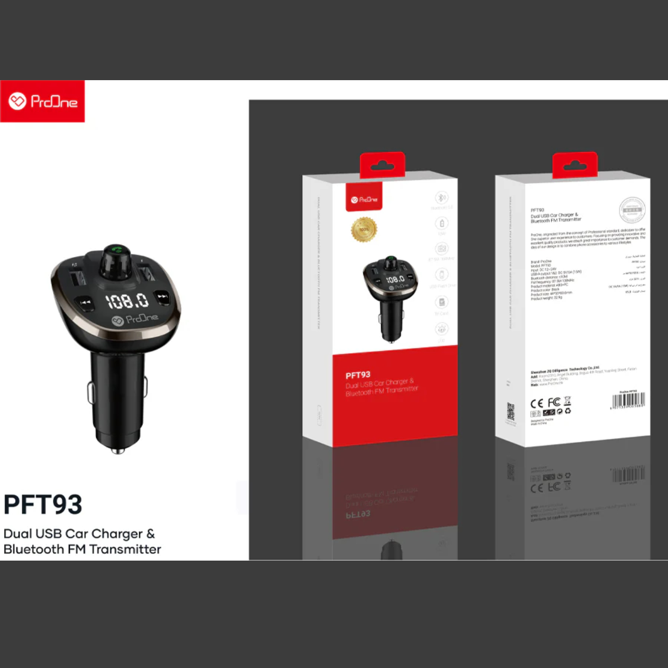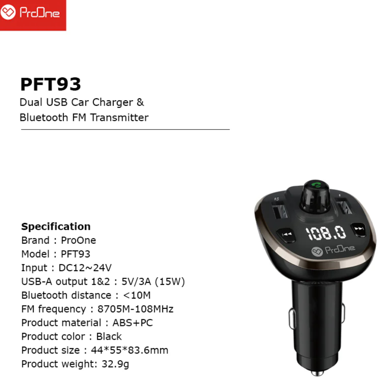 ProOne PFT93 Dual USB Car Charger & Bluetooth FM Transmitter