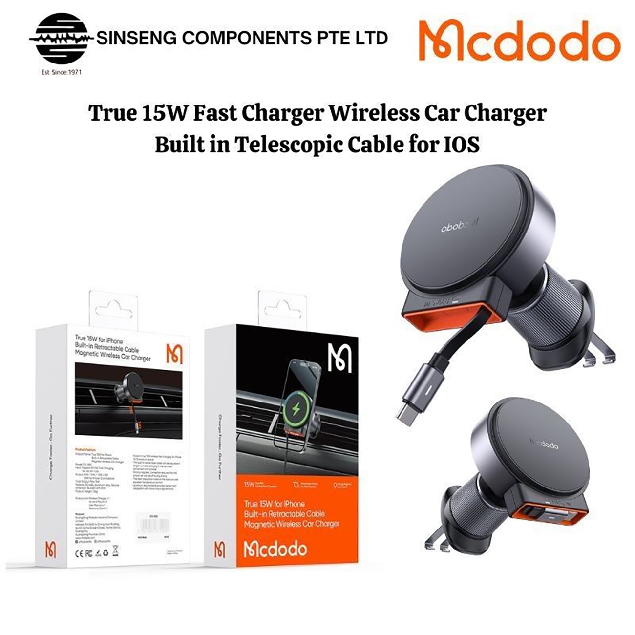 Mcdodo 15W Magnetic Wireless Car Charger with Retractable Cable