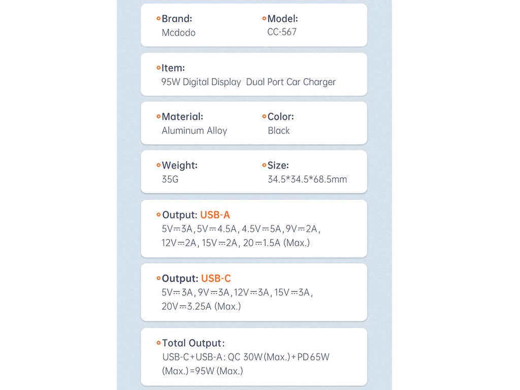| سایر مشخصات | خروجی USB : 5V⎓3A,5V⎓4.5A,4.5V⎓5A,9V⎓2A,12V⎓2A,15V⎓2A,20⎓1.5A (Max.) خروجی Type-C : 5V⎓3A,9V⎓3A,12V⎓3A,15V⎓3A,20V⎓3.25A (Max.) Type-C + USB : QC 30W (Max.) + PD 65W (Max.) |