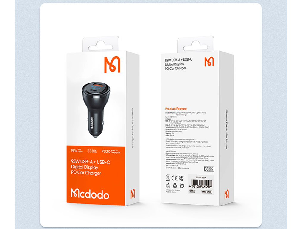 MCdodo CC-5670 95W PD+5A Type-C USB Port Digital Display Fast Car Charger