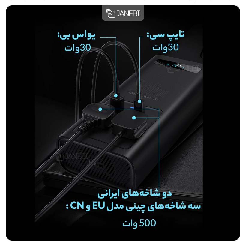 اینورتر و شارژر فندکی فست شارژ ماشین تایپ سی چند کاره 500 واتی بیسوس CGNB000101