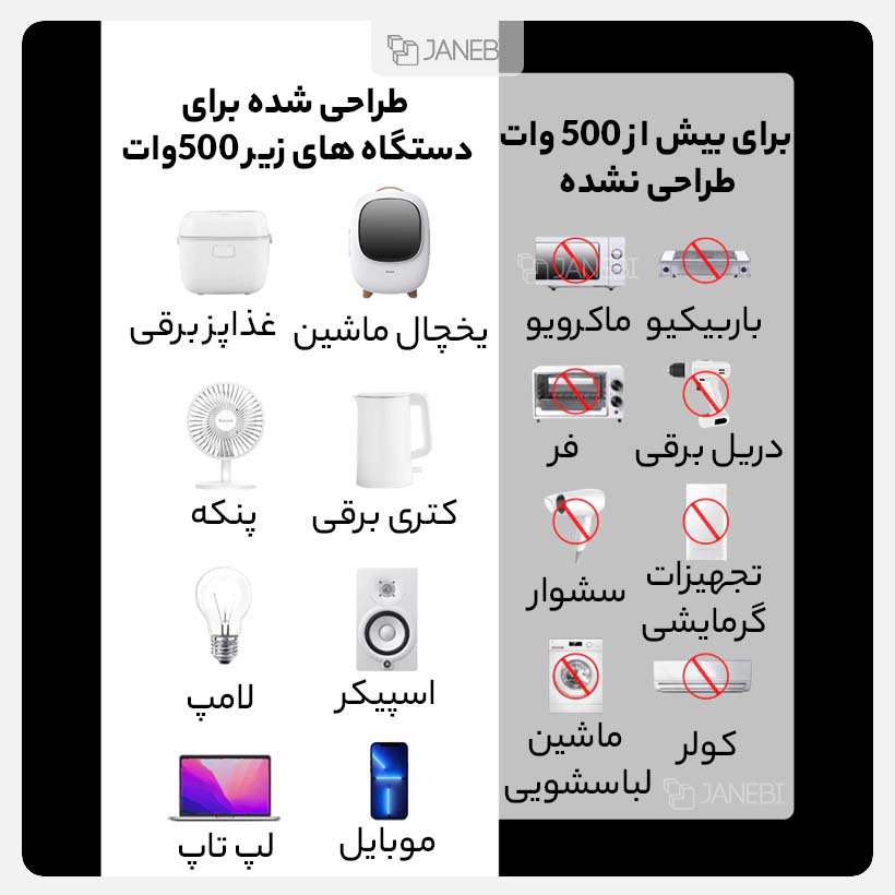 | سایر مشخصات | شدت جریان ورودی DC گیرههای کروکودیلی : 12 وات 60 آمپر شدت جریان ورودی شارژر فندکی DC : 12 ولت 20 آمپر شدت جریان خروجی USB-A : 5 ولت / 3 آمپر، 9 ولت / 2 آمپر، 10 ولت / 2 آمپر، 12 ولت / 2.5 آمپر شدت جریان خروجی USB-C : 5 ولت / 3 آمپر، 9 ولت / 2.77 آمپر، 12 ولت / حداکثر 2.5 آمپر شدت جریان خروجیهای AC توسط سیم های کروکودیلی : حداکثر 200-240 ولت 50 هرتز 500 وات شدت جریان خروجیهای AC توسط شارژر فندکی : 200-240 ولت 50 هرتز 150 وات |