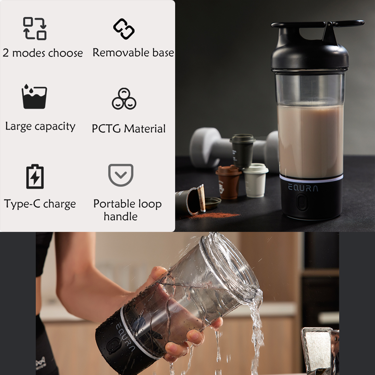 EQURA Electric Shaker Bottle, 750ml Blender Bottles EQURA E-PULSE MIXER E-013