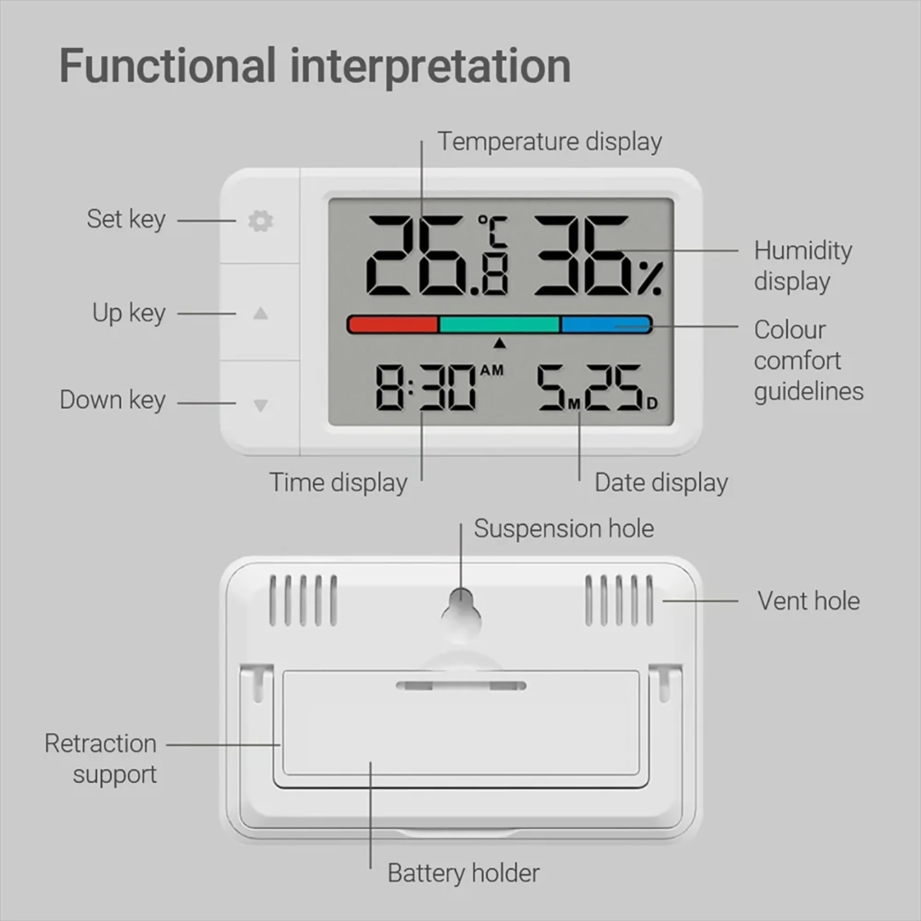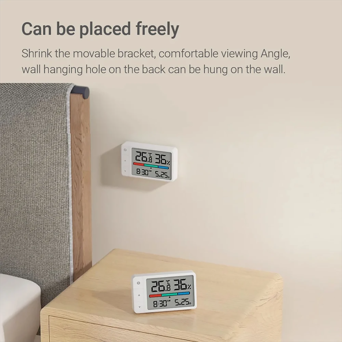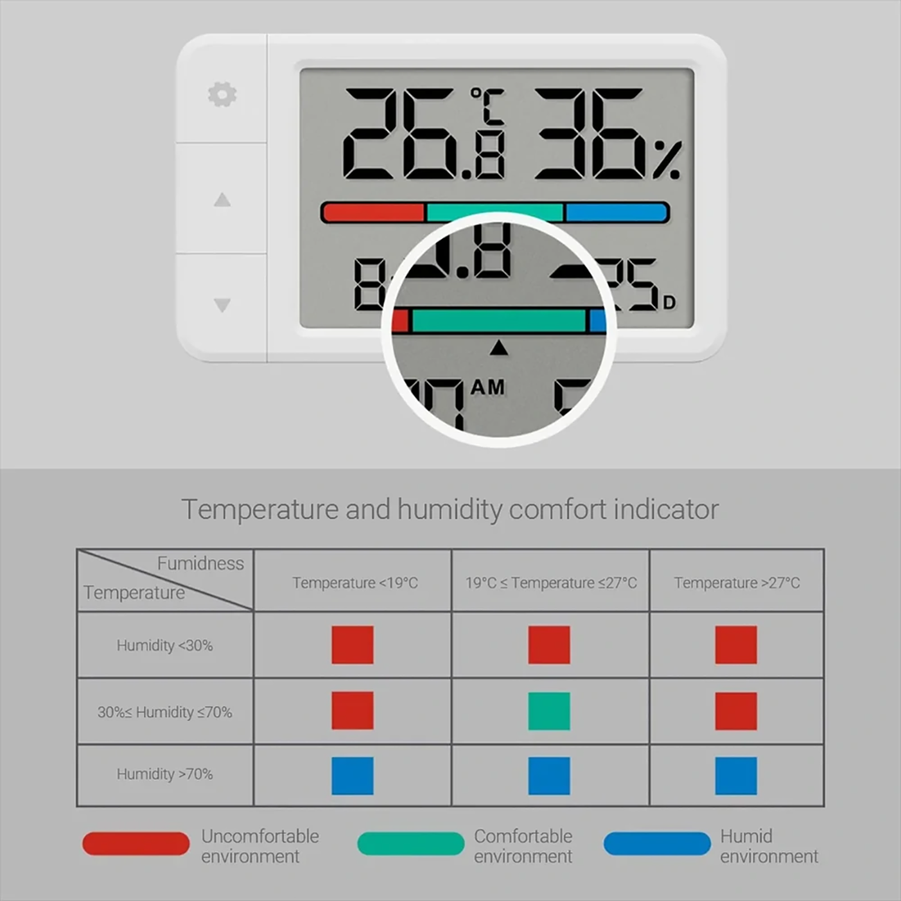 | امکانات نمایش | دما، رطوبت، تاریخ، ساعت، وضعیت محیط |
