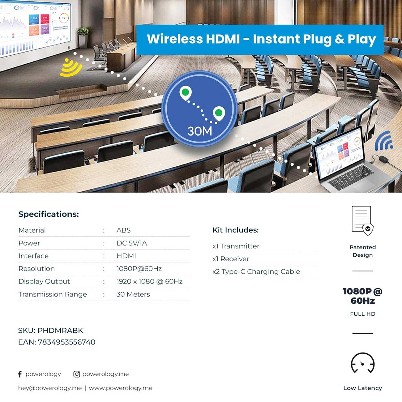 Powerology PHDMRABK Wireless HDMI Mirroring Adaptor Pair with USB-C Cable Full HD 1080P