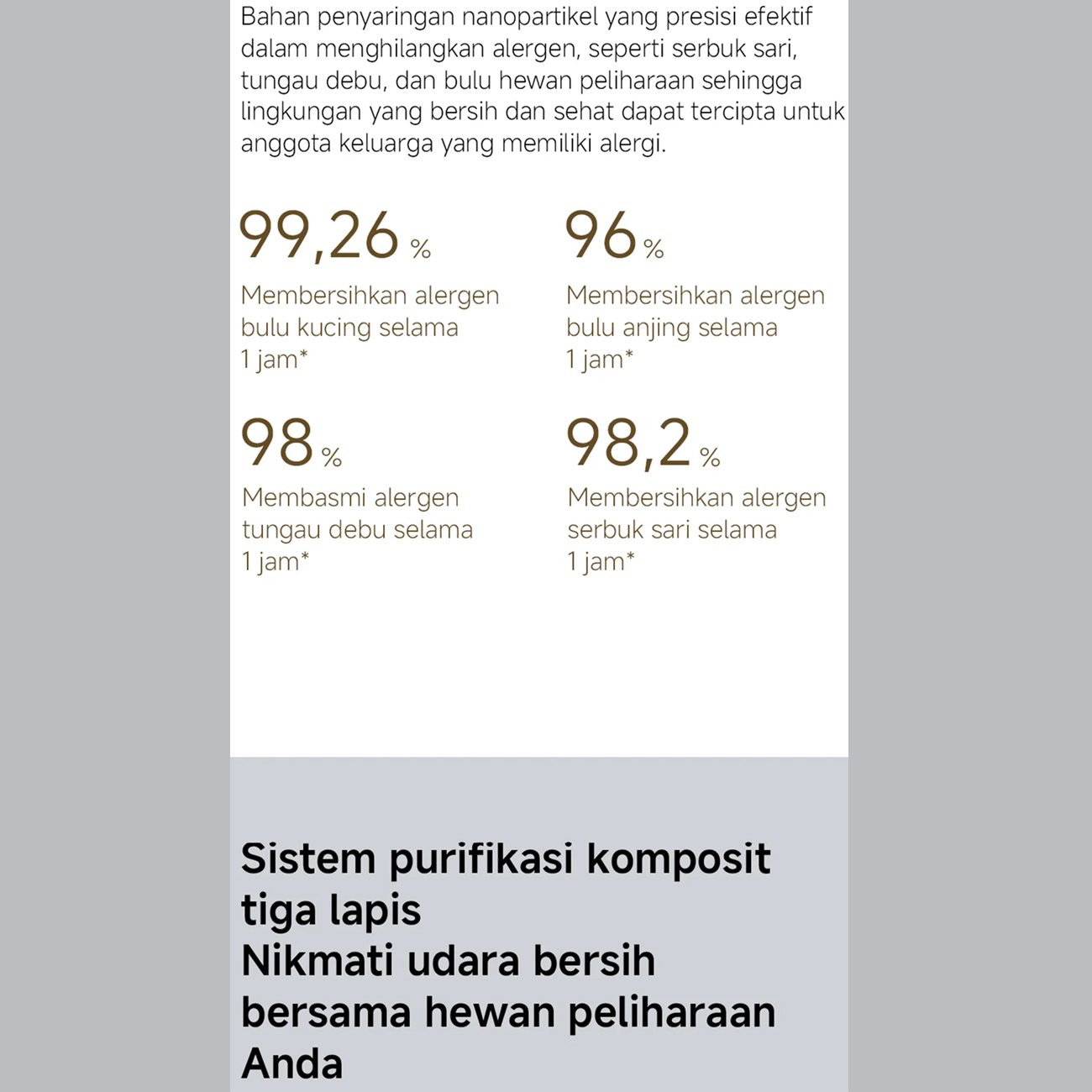 | میزان حذف آلرژنها و بوها | شوره گربه: 99.26% در 1 ساعت / شوره سگ: 96% در 1 ساعت / مایتهای گرد و غبار: 98% در 1 ساعت / گرده گیاهان: 98.2% در 1 ساعت / تریمتیلآمین: 92.4% در 1 ساعت / آمونیاک: 81.2% در 1 ساعت / بن فعال: 130000 میلیگرم |