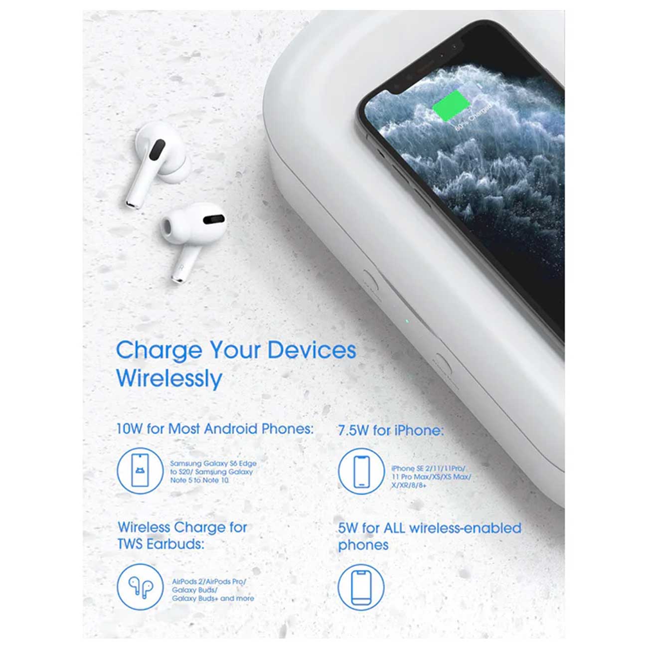 | سازگار با | *10 وات برای اکثر گوشیهای اندروید: سامسونگ گلکسی S6 اج تا 20 دلار / سامسونگ گلکسی نوت 5 تا نوت 10 *7.5 وات برای آیفون: SE 2/11/11Pro/11 Pro Max/XS/XS Max/X/XR/8/8+ *هندزفریها: ایرپادز 2/ایرپادز پرو/گلکسی بادز/گلکسی بادز و ... |