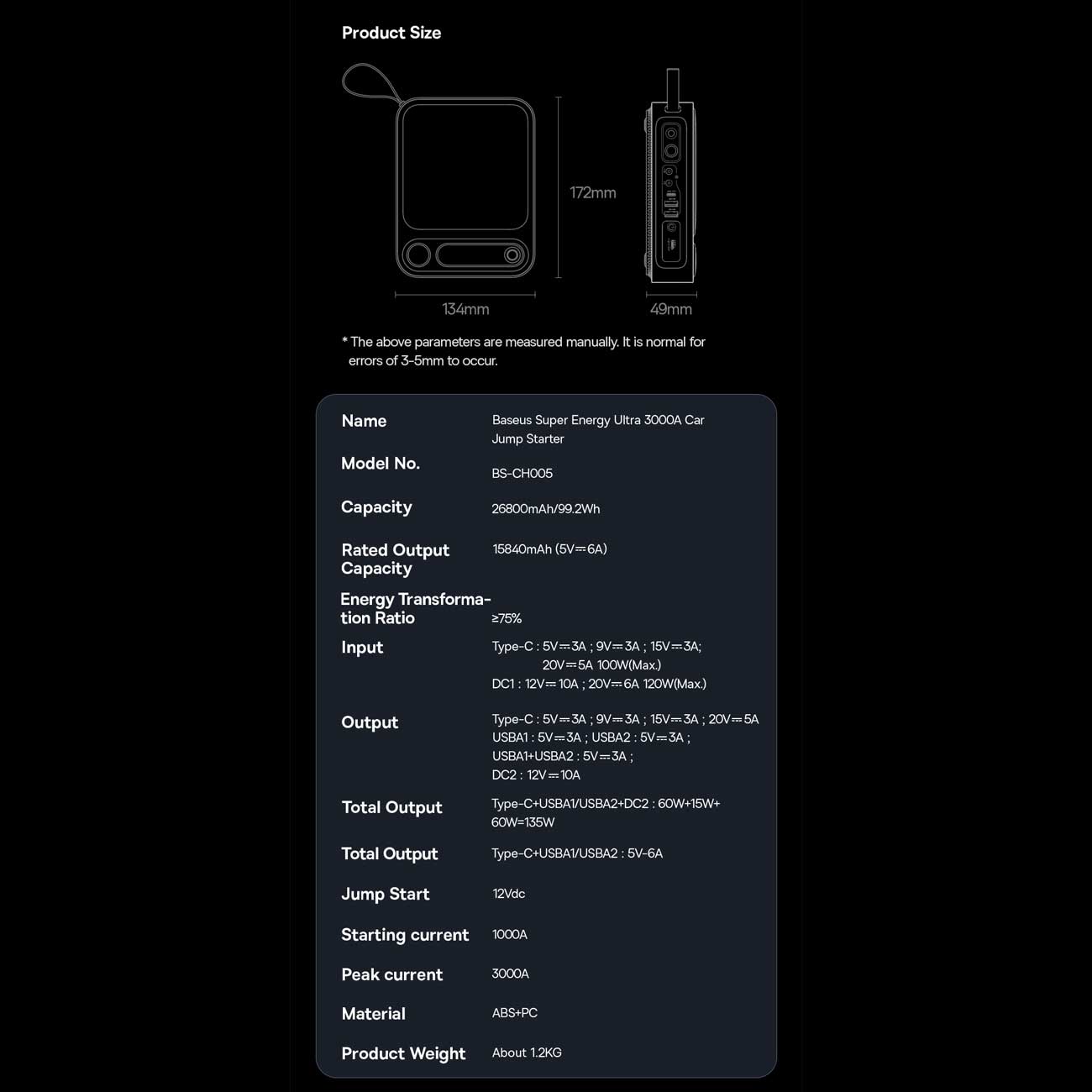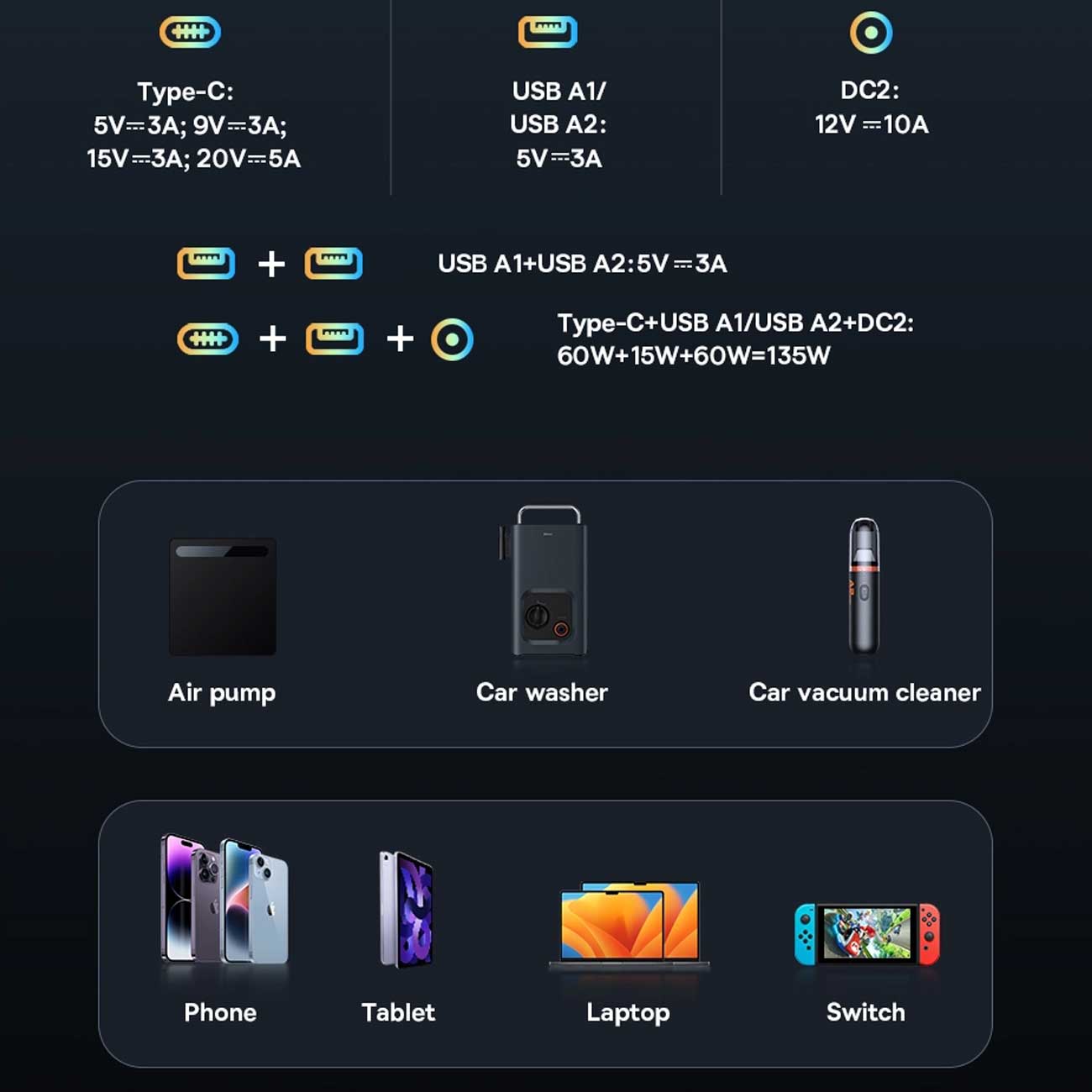 | توان خروجی | کل خروجی: Type-C+USB 1/USBA2+DC2: 60W+15W+60W = 135W Type-C+USBA1+USBA2: 5V-6A |