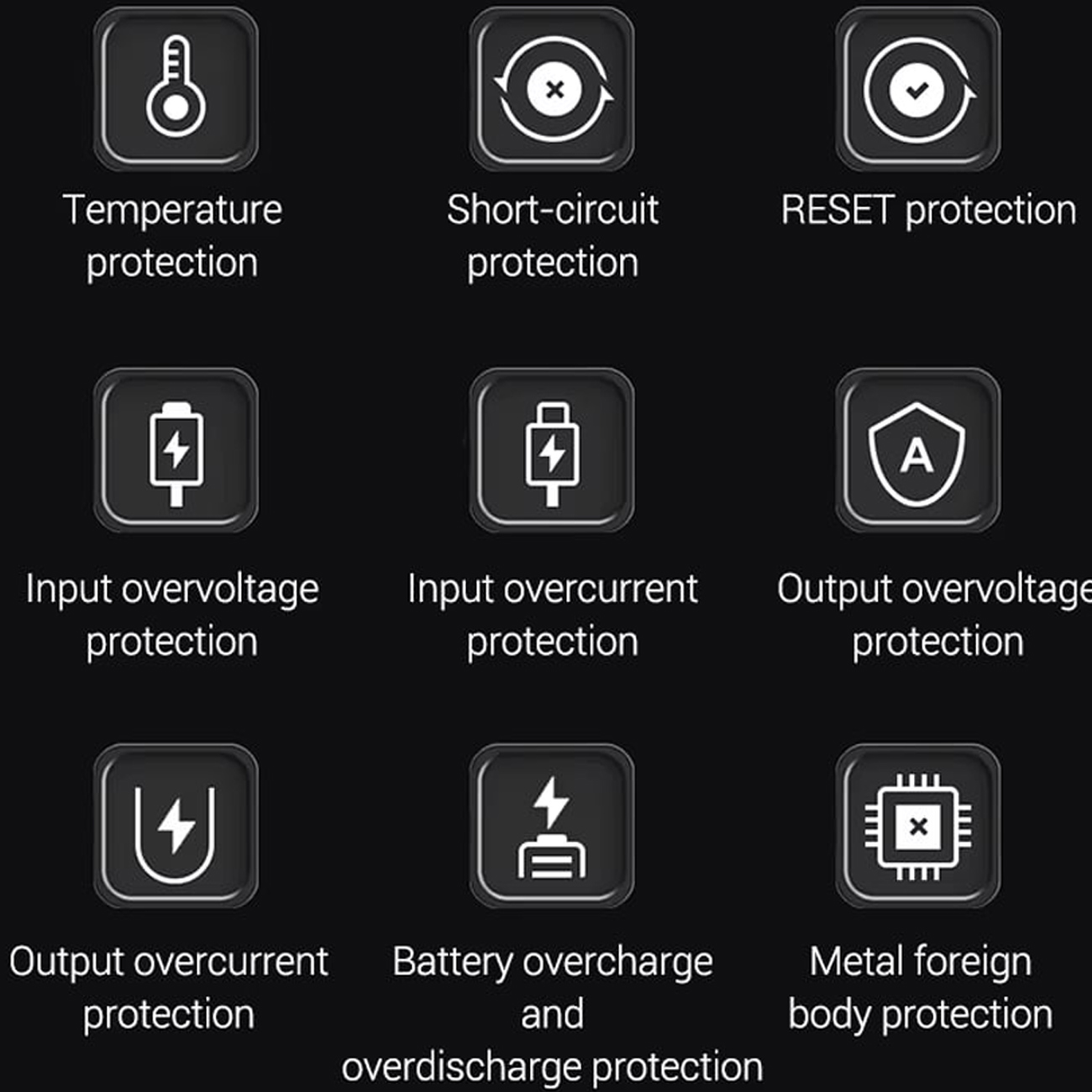 | ایمنی و حفاظت | ولتاژ اضافه، جریان اضافه، دما، اتصال کوتاه، شارژ بیش از حد، تخلیه بیش از حد |