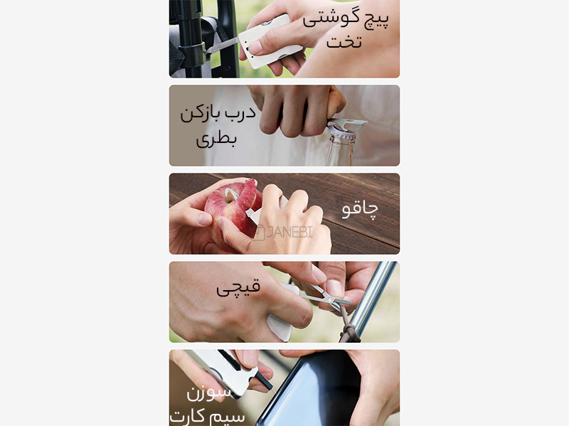 | امکانات | پیچ گوشتی فیلیپس/ در بازکن/ چاقوی قلاب/ چاقو/ درب بازکن بطری/ پیچ گوشتی تخت/ سوهان ناخن/ قیچی کوچک/ پین سیم کارت/ آچار 6-10 میلی متری و سوراخ تطبیق پایه |