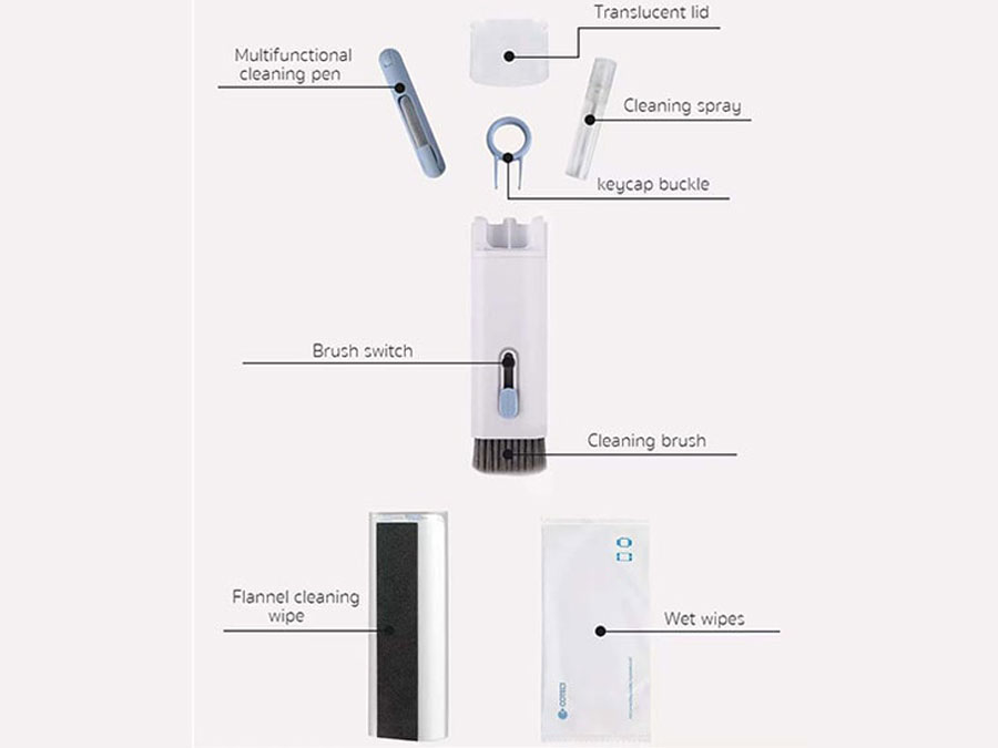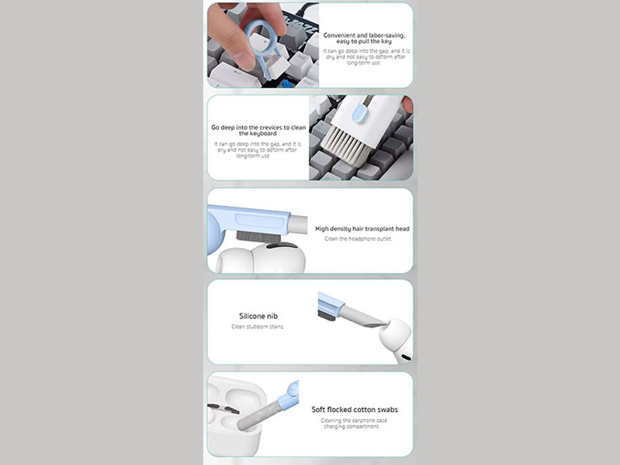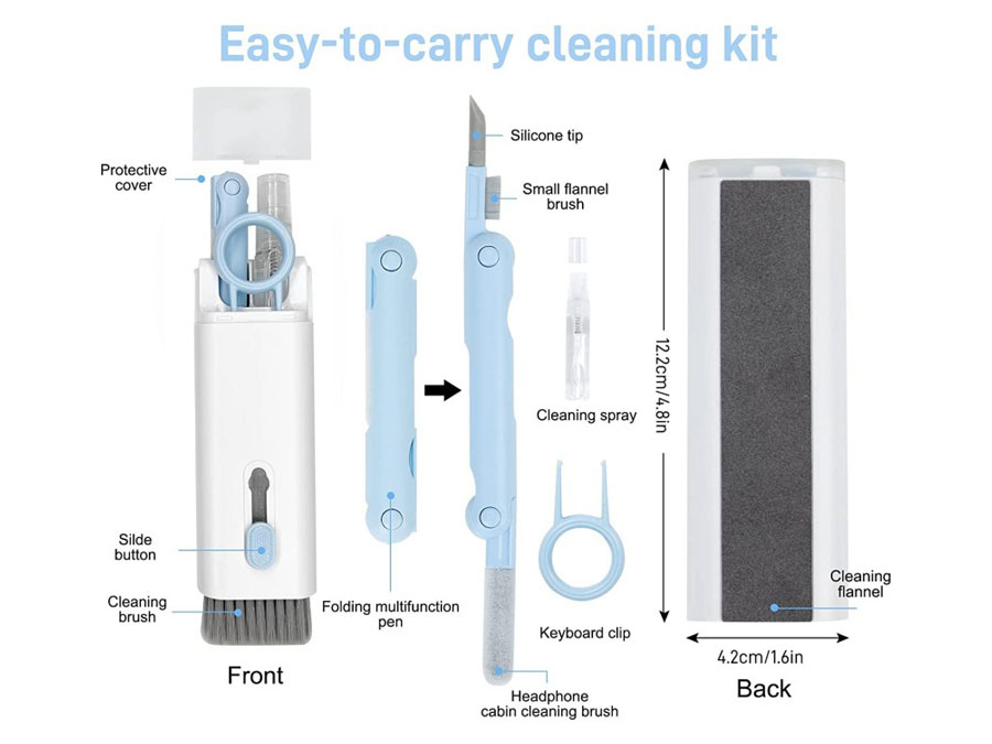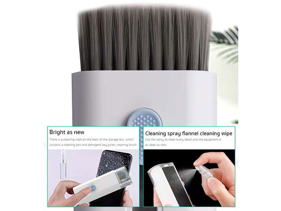 | اقلام موجود در بستهبندی | قلم دارای سه سری سیلیکونی، ابزار نظافت صفحه کلید، برس متصل به جعبه، دستمال و اسپری |