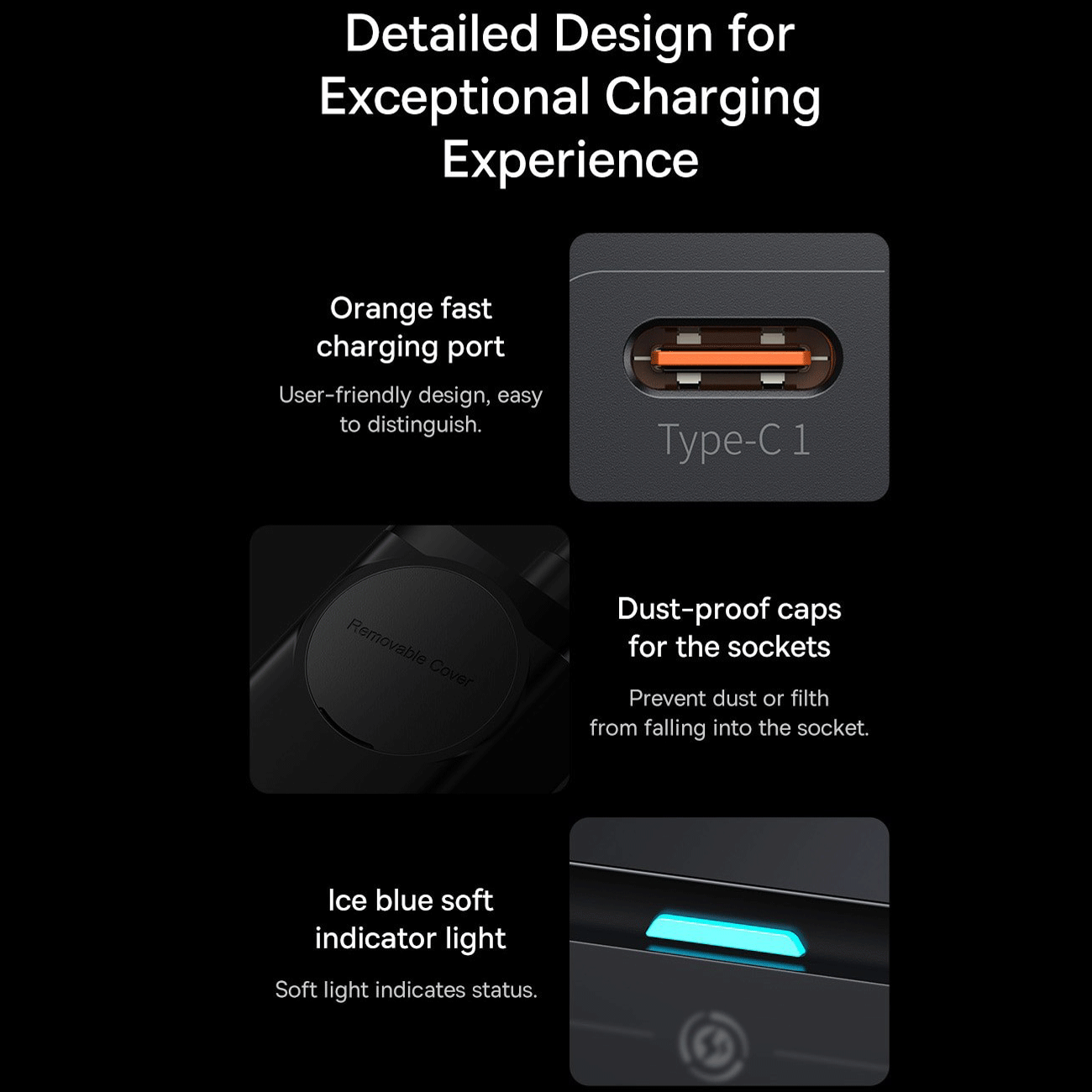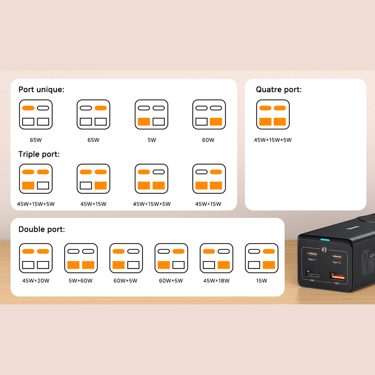 | سایر ویژگی ها | Type-C1/Type-C2: 5.0V-3.0A (15.0W): 9.0V-3.0A (27.0W); 12.DV-3.0A (36.0W); 15.0V-3.0A (45.0W); 20.0V-3.25A (65.0W) USB1: 5.0V-1.0A (5.0W) USB2 output: 5.0V-3.0A (15.0W); 9.0V-3.0A (27.0W); 12.0V-3.0A (36.0W); 20.0V-3.0A (60.0W) Type-C1+Type-C2: 45.0W+20.0W Type-C2+USB2 output: 5.0V-3.0A (15.0W) Type-C1-USB2 output: 45.0W+18.0W Type-C1/ Type-C2+USB1 output:60.0W+5.0W Type-C1+Type-C2/USB2+USB1: 45.0W+15.0W+5.0W Type-C1+(Type-C2+USB2)+USB1: 45.0W+15.0W+5.0W |