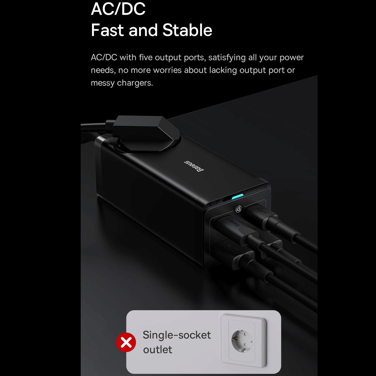 چندراهی برق یک سوکت، دو یو اس بی و دو تایپ سی 65 وات شارژ سریع رومیزی بیسوس CCGAN65-1ACE BS-PSZM000901