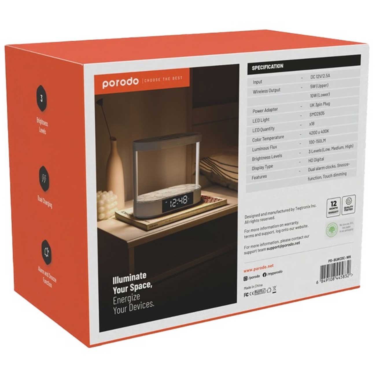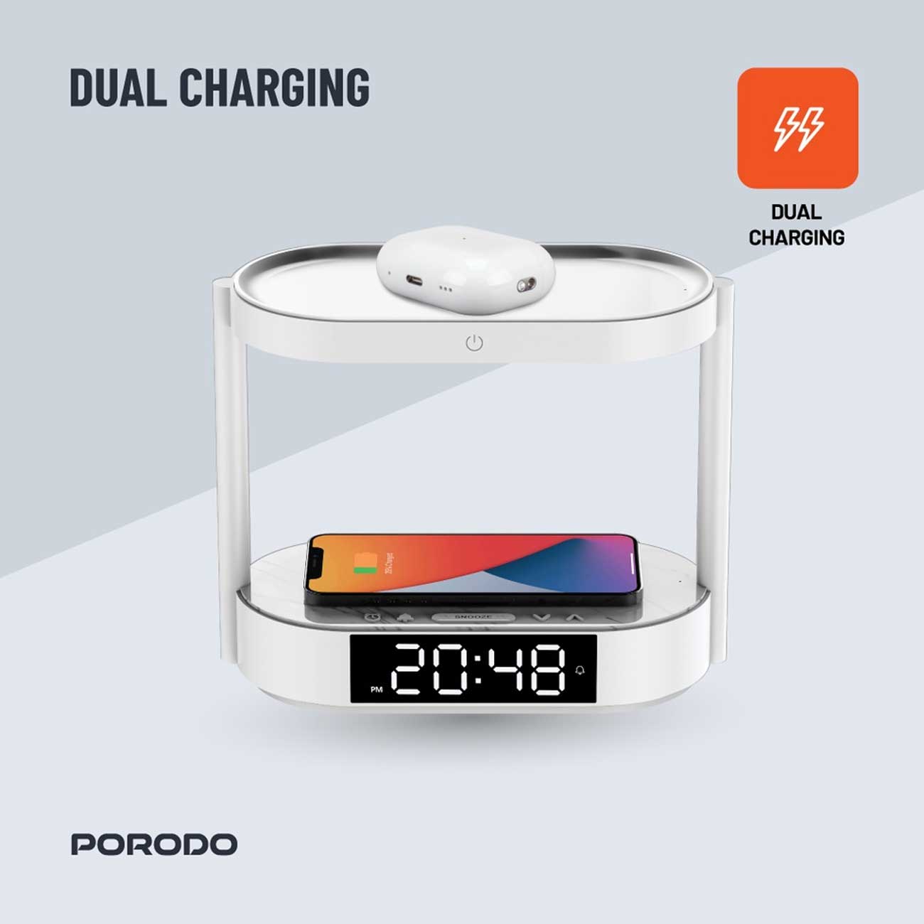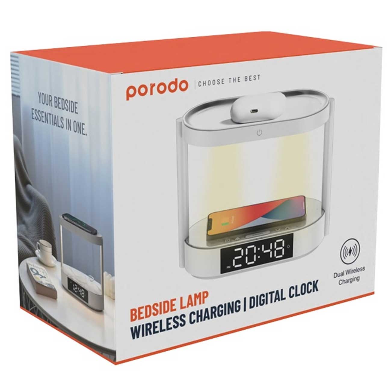 Porodo Bedside Lamp with Wireless Charger and Digital Clock PD-BLWCDC-WH