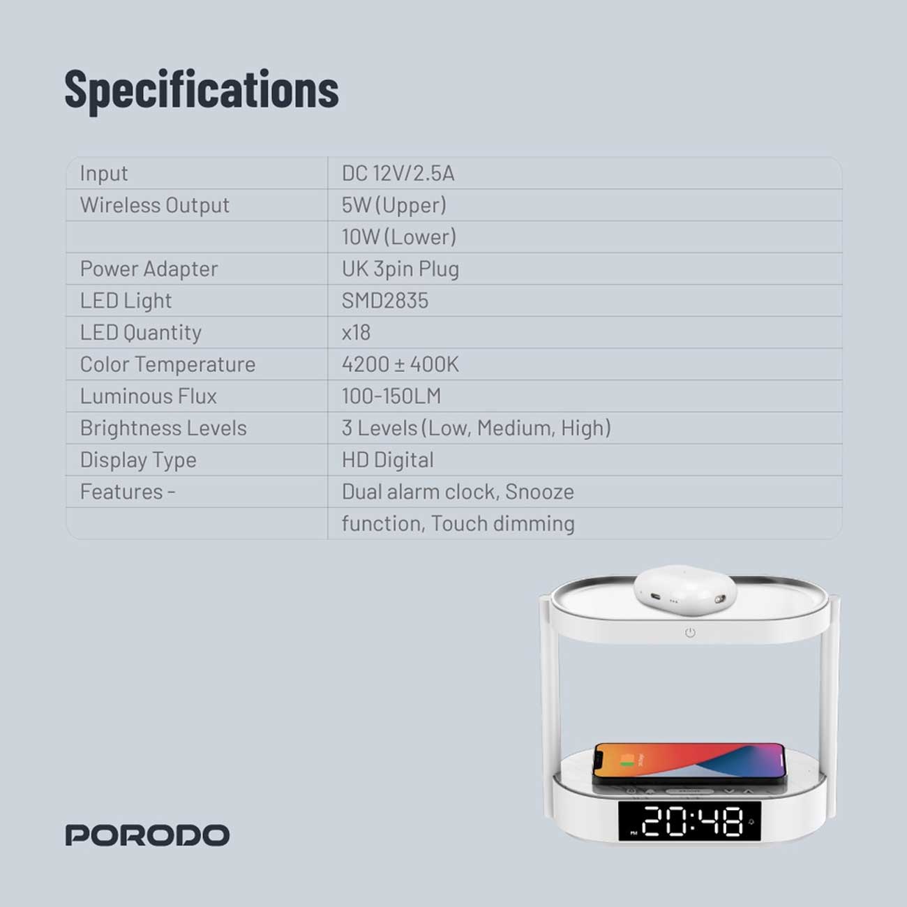 شارژ بیسیم 10وات و چراغ خواب و ساعت دیجیتال رومیزی پورودو PD-BLWCDC-WH
