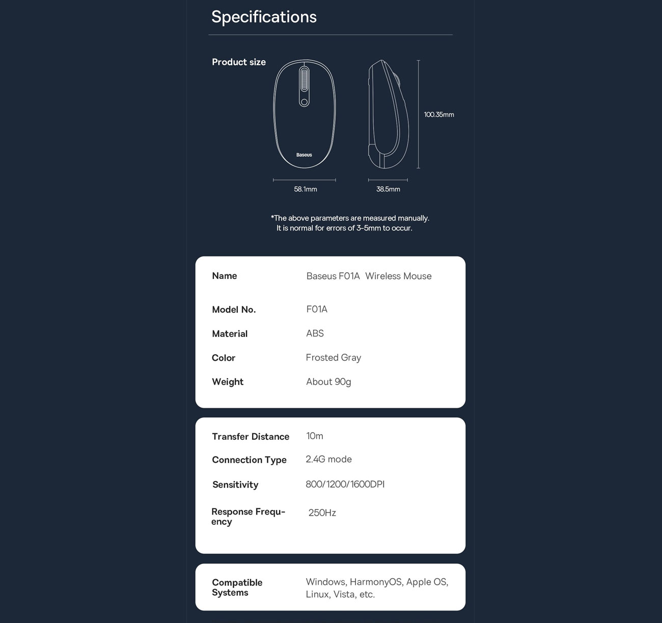 Baseus Souris Wireless mouse B01055502833 F01A 2.4G 1600DPI