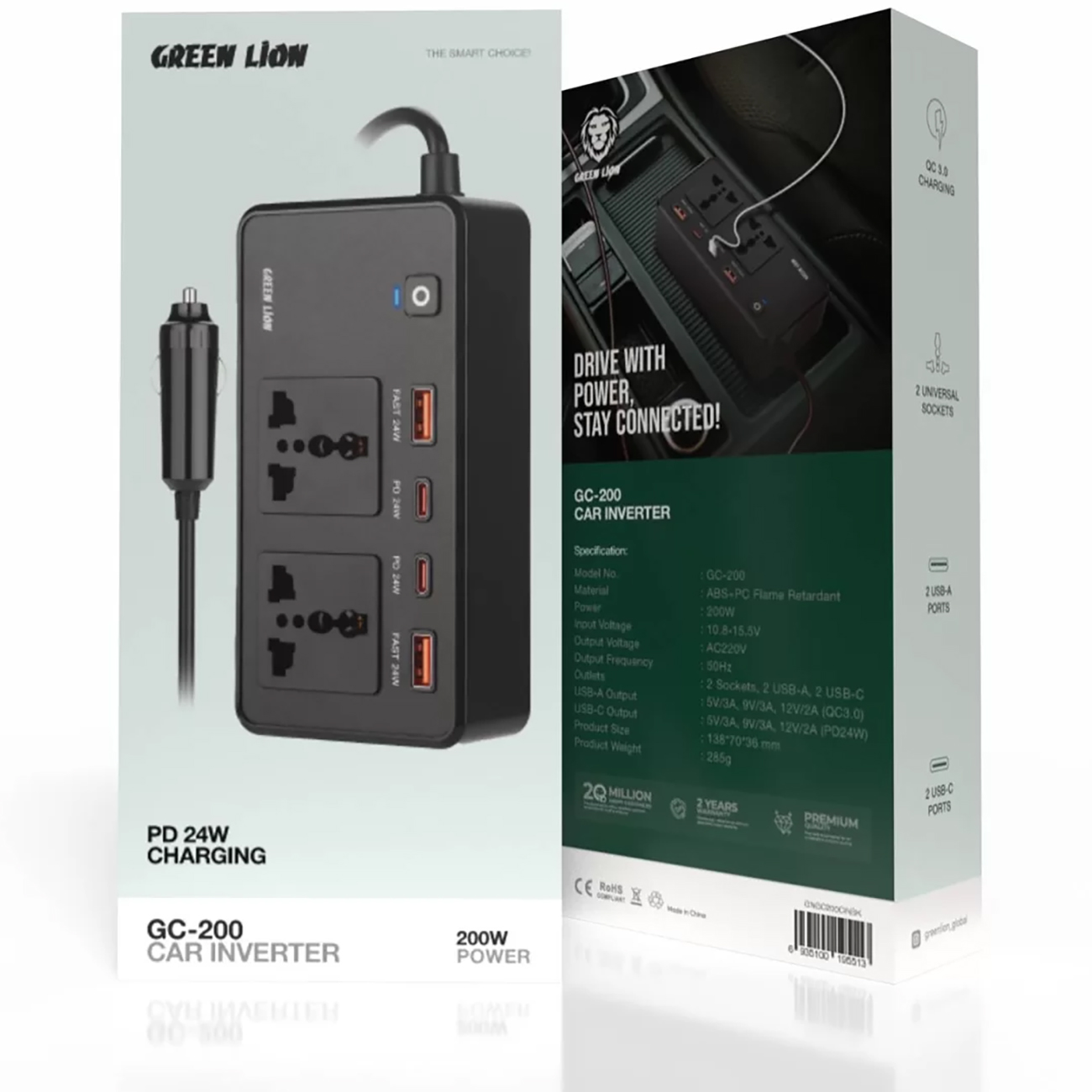 اینورتر خودرو 200 وات و شارژر فندکی فست شارژ ماشین تایپسی گرینلاین GC-200